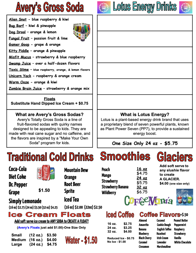 Ice Cream Caboose Menu